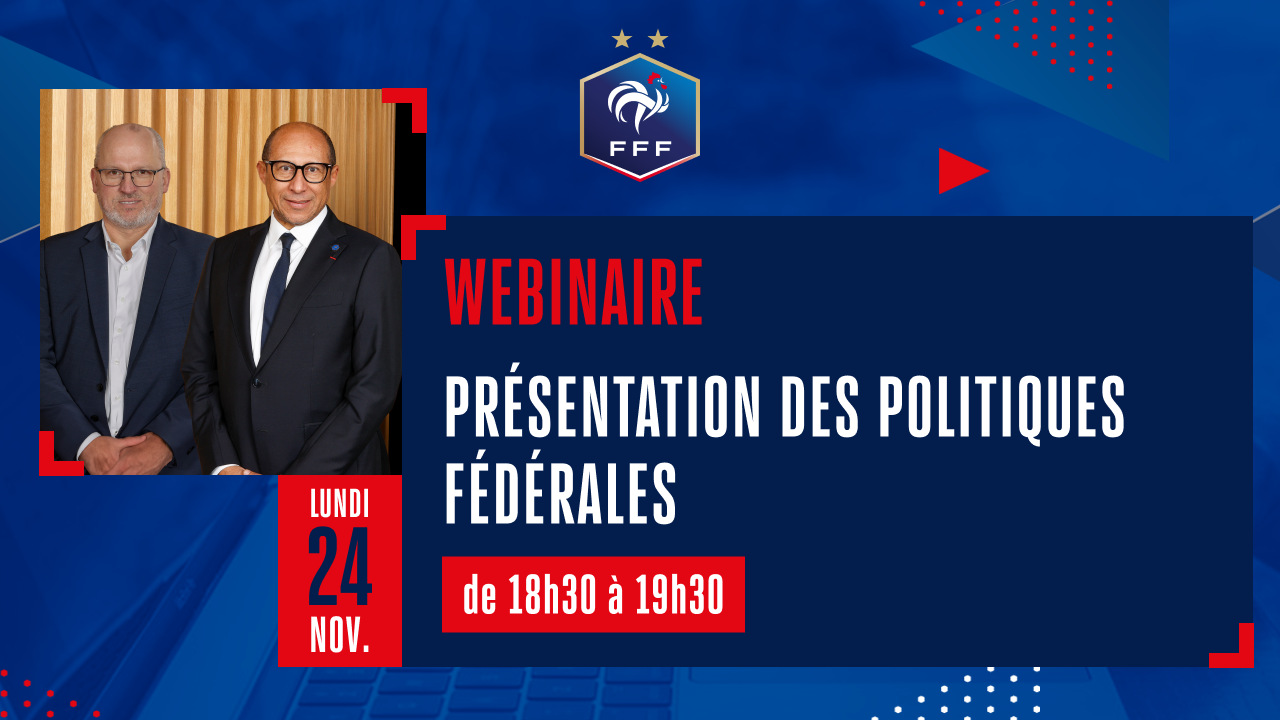 Deux jours plus tard, les 24 et 25 novembre prochains, la Fédération Française de Football et la Ligue du Football Amateur organisent la 4e journée Interrégionale du Football à Marcq-en-Barœul, avec les clubs des régions des Hauts-de-France, du Grand Est et de Paris/Ile-de-France. A cette occasion, les acteurs du football amateur de ces trois ligues sont conviés à assister à un Webinaire le lundi 24 novembre, de 18h30 à 19h30, qui présentera les Politiques Fédérales en présence de Philippe Diallo, président de la FFF et de Claude Delforge, président de la LFA : cliquez ici pour s’inscrire au webinaire.
