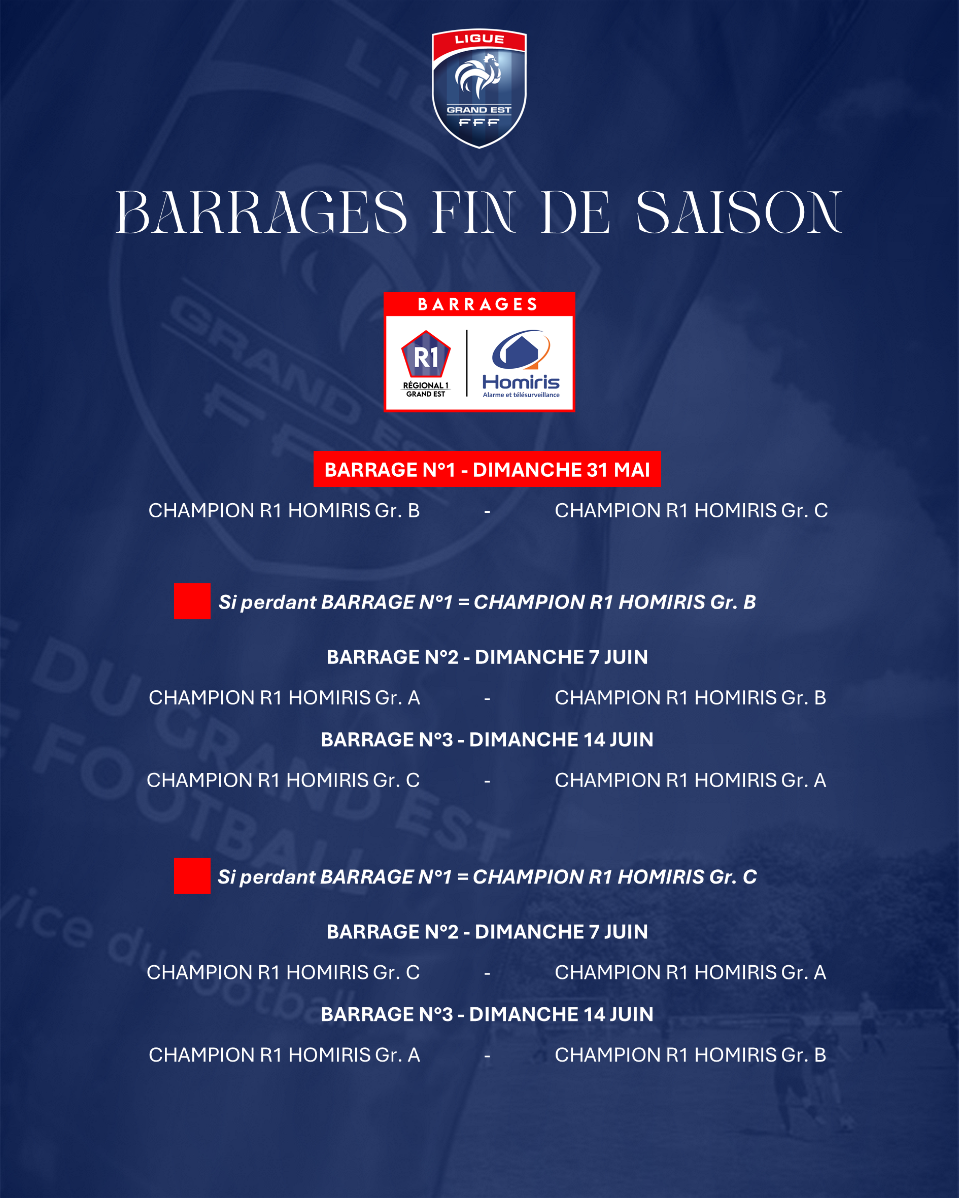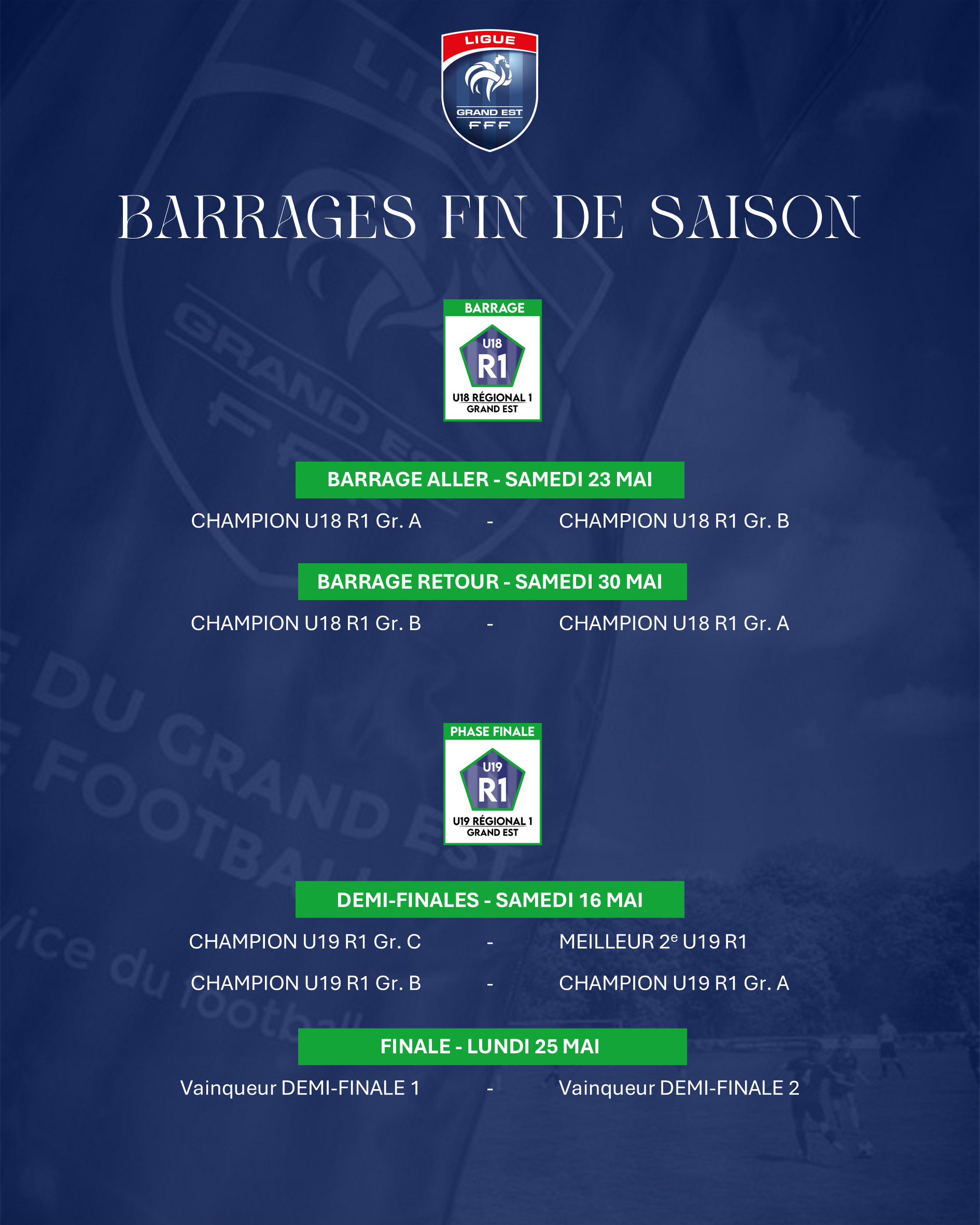 La Ligue du Grand Est de Football a procédé aux tirages des barrages de fin de saison, déterminant l’ordre des rencontres pour les différents champions : accession de R1 Homiris vers le National 3, accession U18 R1 vers le CN U19 et la phase finale U19 R1.