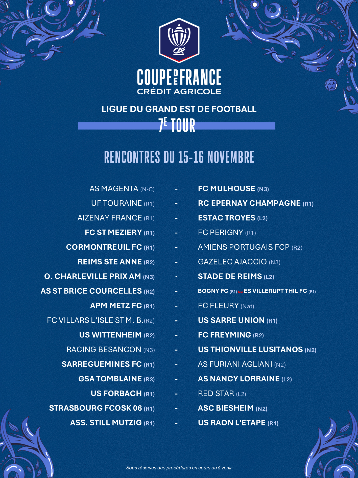 La Fédération Française de Football a procédé au tirage au sort du 7e tour de la Coupe de France Crédit Agricole depuis le CNOSF à Paris. Les 23 clubs du Grand Est ont été répartis en trois groupes géographiques. Découvrez leurs adversaires !