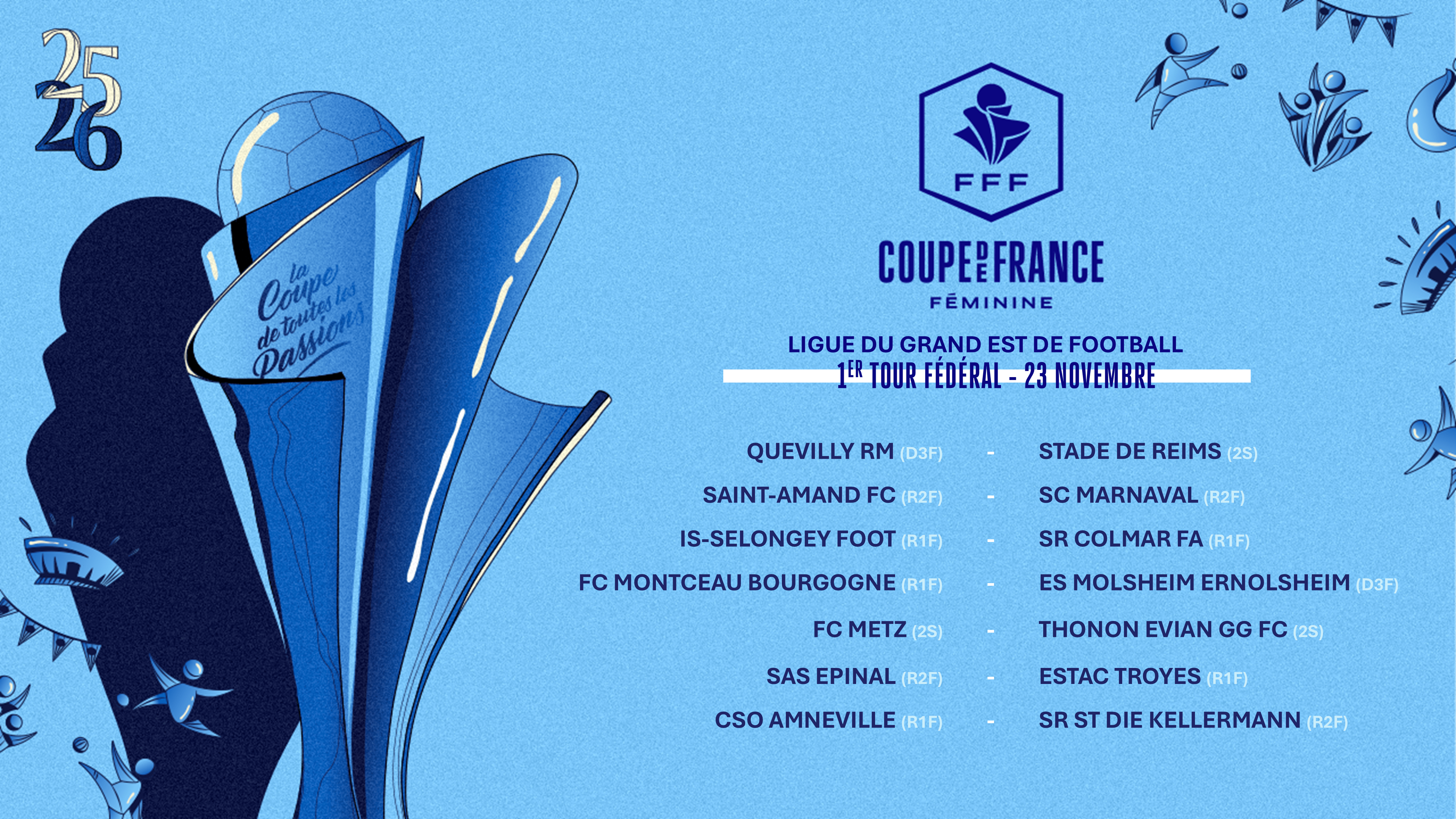 La Fédération Française de Football a procédé au tirage au sort du 1er tour fédéral de la Coupe de France Féminine. Neuf clubs du Grand Est étaient concernés par le tirage : les sept équipes issues de la phase régionale auxquelles s’ajoutent les deux formations de Seconde Ligue (FC Metz et Stade de Reims). Les rencontres sont programmées le 23 novembre.