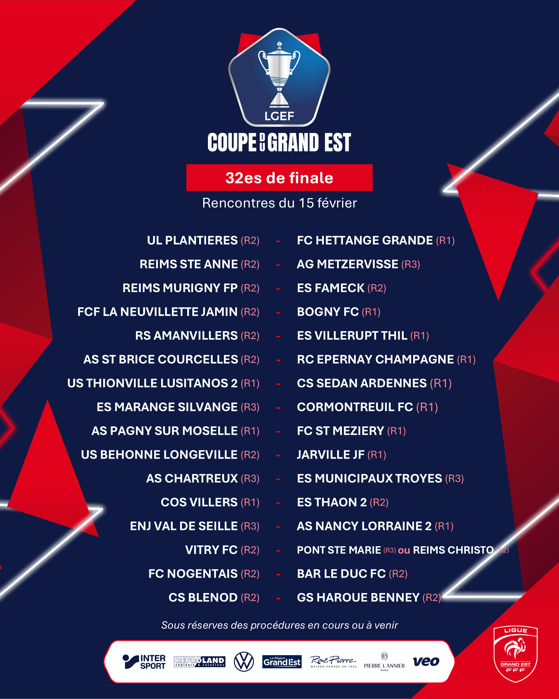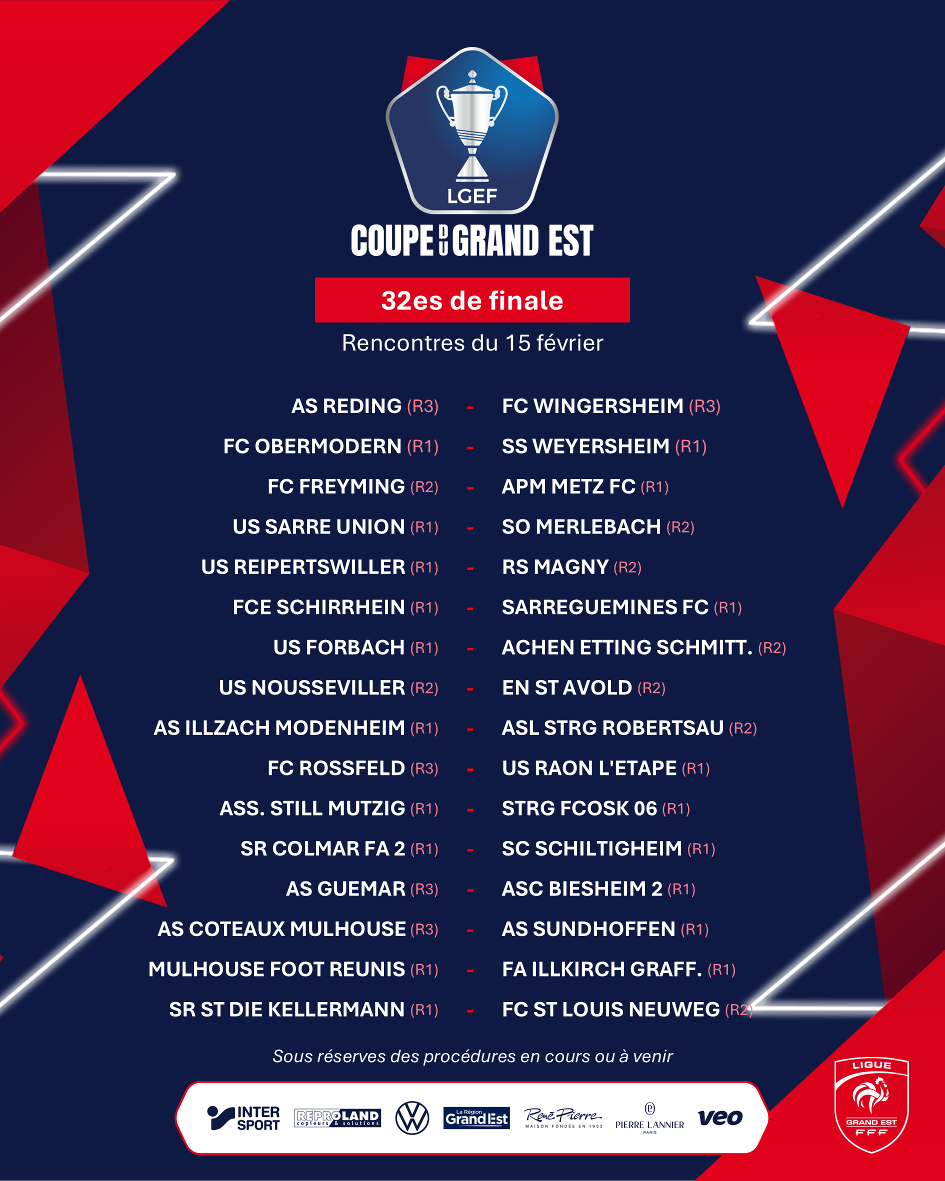 Le tirage des 32es de finale de la Coupe du Grand Est s’est déroulé ce mercredi 21 janvier depuis le siège IHE Energies, partenaire de la LGEF. Il a été effectué en présence de Ludovic Guerriero, double vainqueur de l’épreuve avec Hombourg-Haut. Les rencontres sont programmées le dimanche 15 février par défaut.