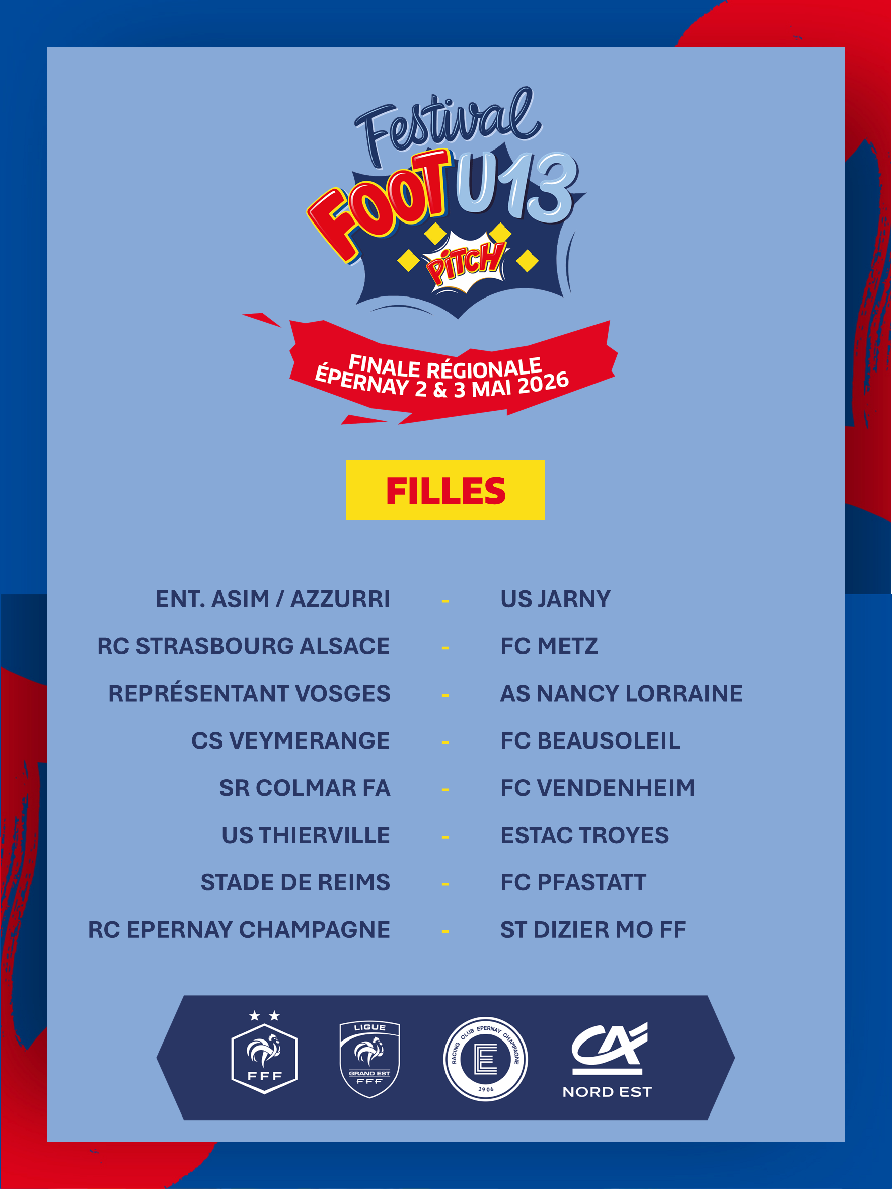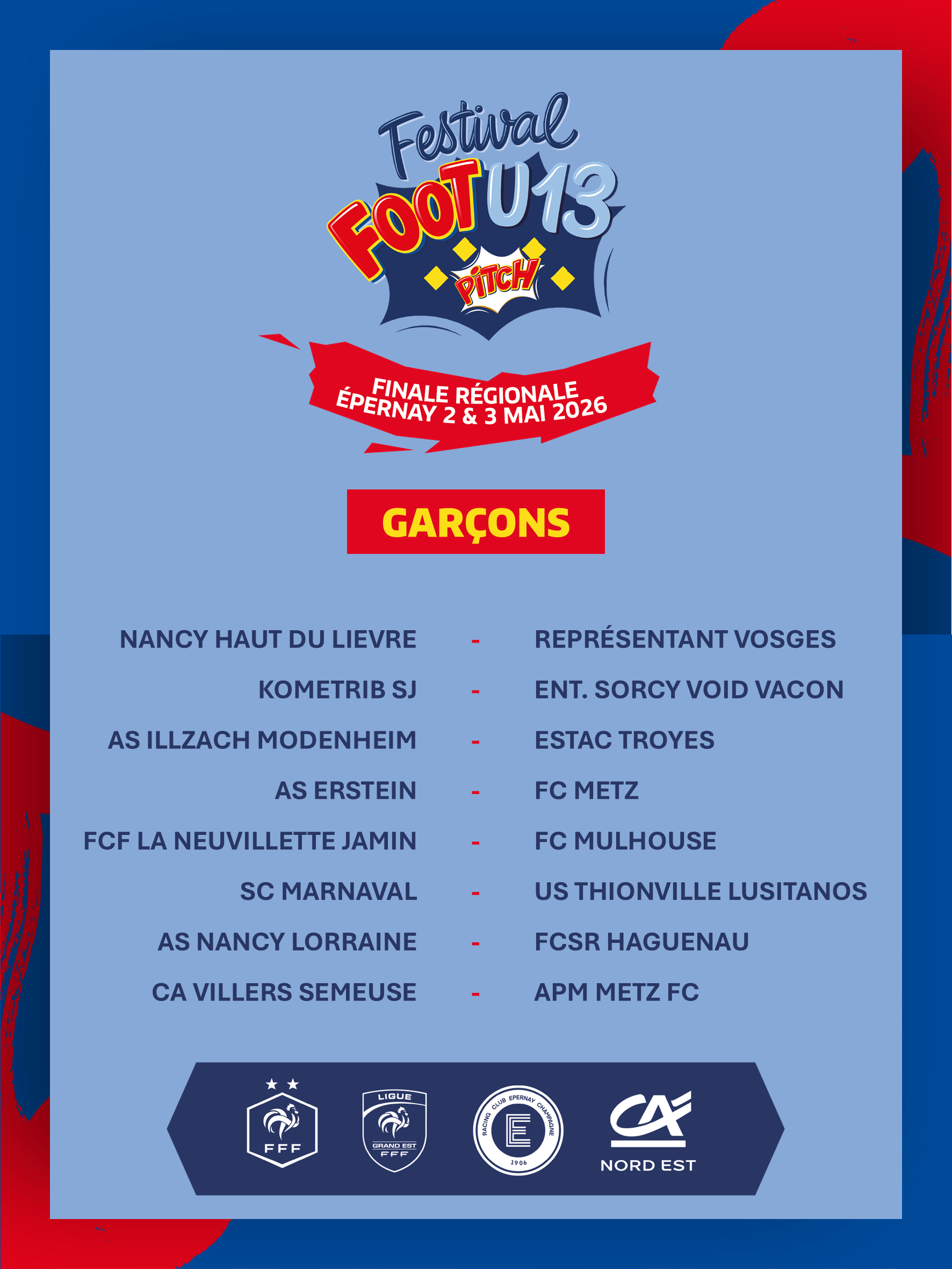 Le tirage au sort de la première rotation de la phase régionale du Festival Foot U13 Pitch a été effectué ce mercredi 8 avril depuis l’agence Reims Boulingrin du Crédit Agricole Nord Est. La finale se déroulera sur les installations du RC Epernay Champagne dans la Marne les 2 et 3 mai prochains !