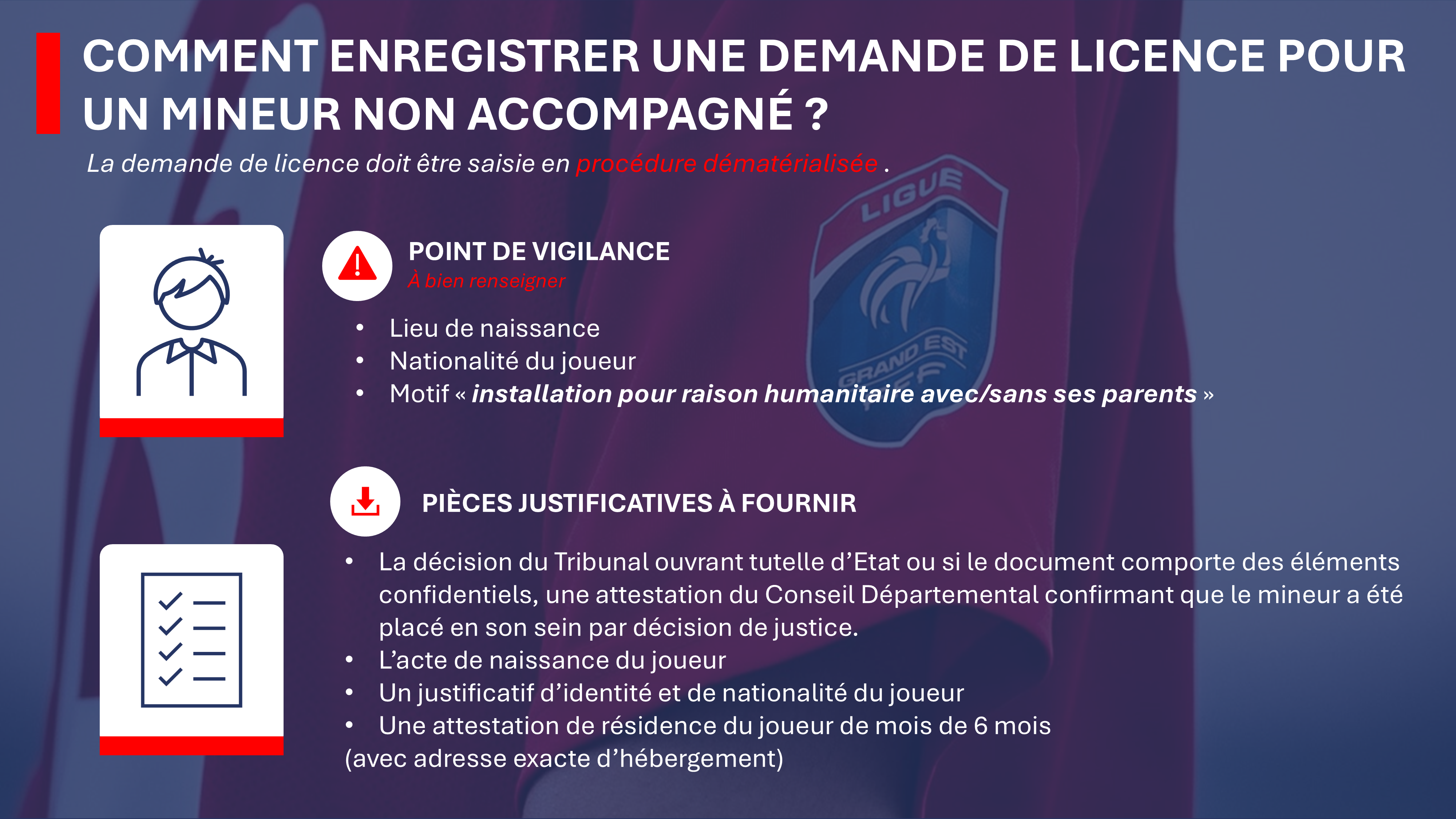 Les demandes de licence en cours (antérieures au 5 mars 2026) ne peuvent pas être traitées et seront supprimées par le service des licences de la LGEF. Il revient ensuite aux clubs de saisir une nouvelle demande de licence pour le joueur mineur non accompagné.