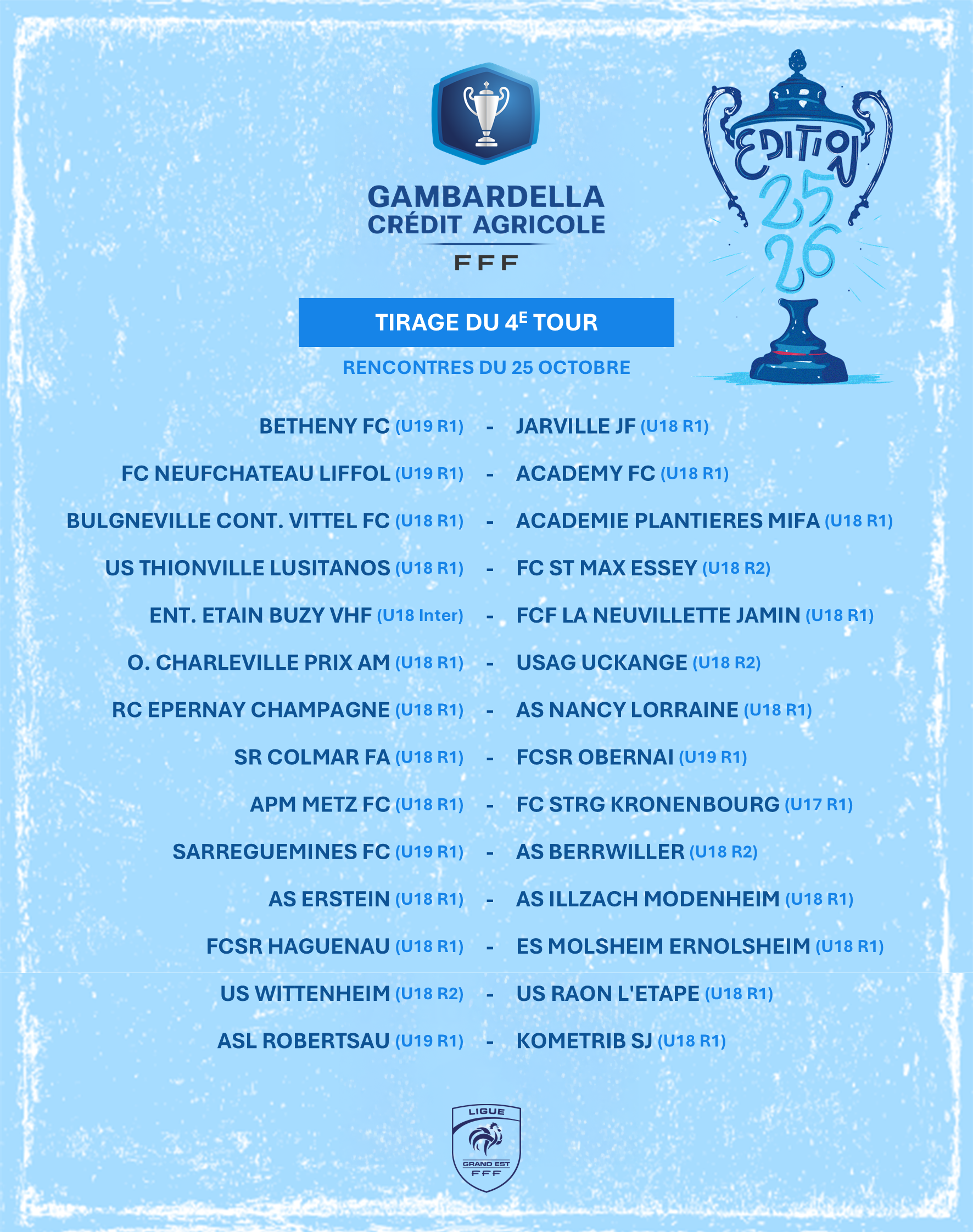 En présence du prestigieux trophée de l’épreuve et des clubs qualifiés, Haguenau a accueilli le tirage du 6e tour de la Coupe de France Crédit Agricole et celui du 4e tour de la Coupe Gambardella Crédit Agricole ce mercredi 15 octobre. Découvrez les affiches programmées le week-end des 25 et 26 octobre.